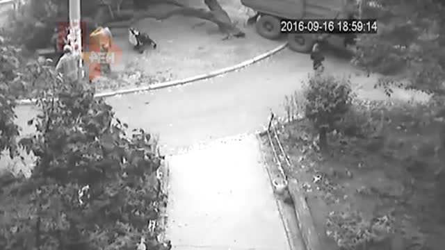 Камера наблюдения зафиксировала, как КамАЗ въехал во двор на улице Торговая. Водитель сдал назад и сбил дерево, которое упало с корнем на ребенка с матерью.