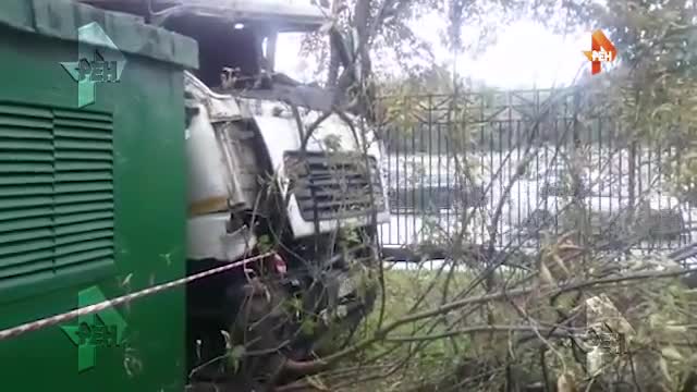 Авария произошла на юге столице. Мусоровоз двигался по Дербеневской набережной. Его зацепил автомобиль "Хонда-Легенд". Водитель грузовика попытался уйти в сторону, в результате чего протаранил металлическое заграждение и влетел на территорию учебного заведения.