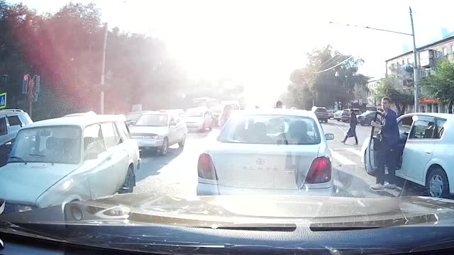 В Хакасии в Абакане очевидцы сняли драку посреди оживленного перекрестка. Агрессивный пассажир не стал ждать, пока ему откроют дверь и сам ворвался в салон обидчика своей подруги.