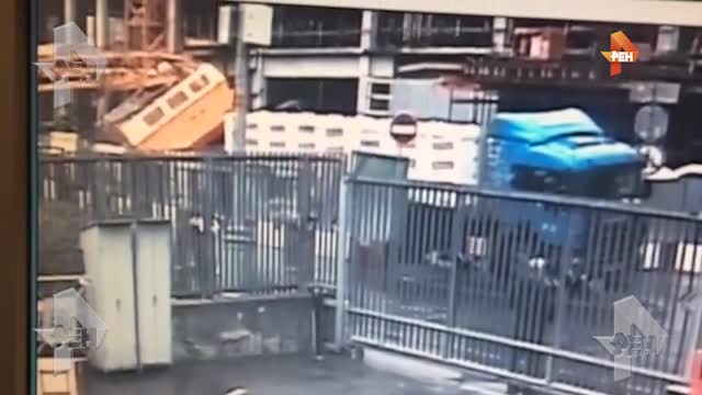 Камеры наружного видеонаблюдения зафиксировали крушение строительного крана в центре Москвы. На кадрах видно, что один из мужчин только чудом выжил: видя, что кран падает, он убежал с опасного места.