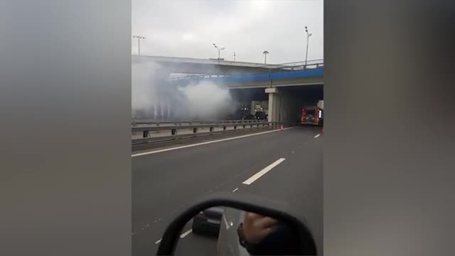 На кадрах видно, что экстренные службы занимаются ликвидацией возгорания грузовика. Движение на обеих сторонах участка кольцевой дороги, где работают пожарные, затруднено.