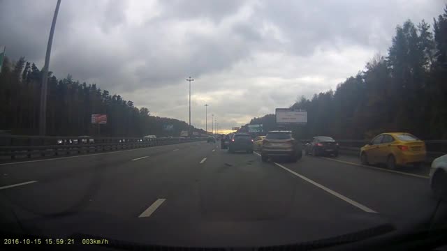 Видеорегистратор легковушки зафиксировал момент массового ДТП на Киевском шоссе в Москве. На кадрах записи видно, как на дороге столкнулось несколько иномарок.