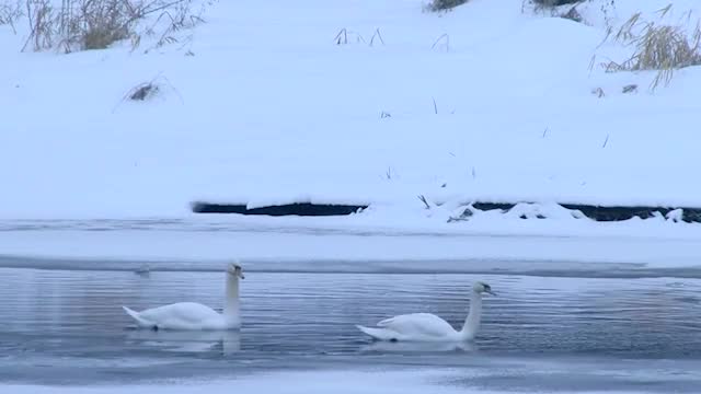 В подмосковном городе Руза лебедь не бросает раненую подругу и остается с ней на замерзающей реке. Птицы плавают на одном из немногих участков реки, которые еще не покрыты льдом.