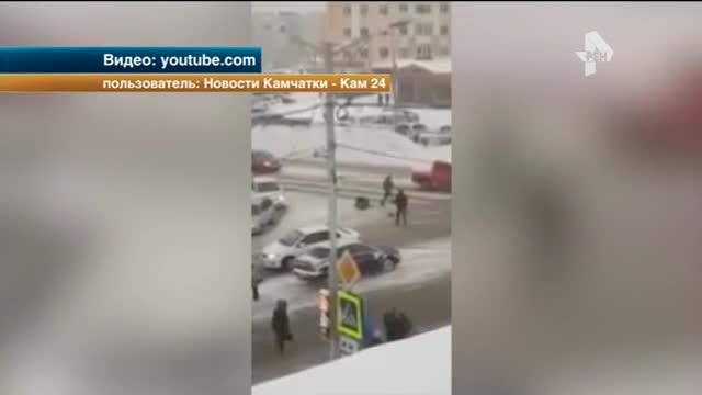 На Камчатке водители избили неадекватного мужчину, который возомнил себя регулировщиком движения. На кадрах ролика, снятого очевидцем потасовки, видно, как непрошеный помощник дорожных инспекторов размахивает руками в центре перекрестка.