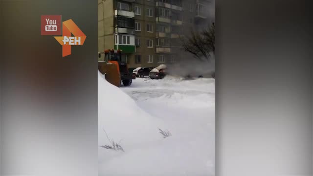 На видео запечатлен момент тушения. Поблизости оказался погрузчик, который немедленно начал подвозить к объятой огнем машине снег. Таким способом удалось сбить пламя и потушить автомобиль.