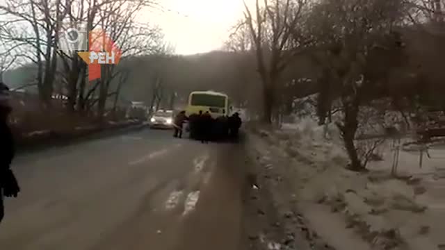 Утром 6 февраля пассажирам во Владивостоке пришлось толкать автобус, чтобы он поехал.