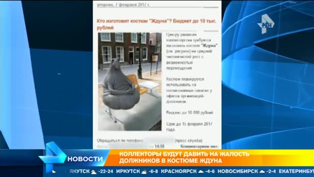 Главная Новости В России 08 февраля 2017, 10:24 Коллекторы будут выбивать долги в костюме Ждуна Поделиться 2017-02-08T10:24:52+03:00 00:25 Коллекторы будут выбивать долги в костюме Ждуна Популярный интернет-мем Ждун поможет выбивать долги. Образ необычного героя соцсетей приглянулся коллекторам, и они взяли его на вооружение. Сотрудники фирм по взысканию задолженностей уже подыскивают мастера, который сможет изготовить костюм. За эту работу они предлагают 10 тысяч рублей. Планируется, что коллекторы в наряде Ждуна будут сидеть в офисах компаний-должников в ожидании возврата денег или начала работы судебных приставов. Отметим, что несколько визитов уже запланированы. В числе первых "Ждун" посетит главное здание известной сети аптек. Коллекторы Подпишитесь и получайте новости первыми Читайте также ВС РФ нанесли удар "Орешником" в ответ на атаку Киева на резиденцию Путина Эксперт Кнутов: удар возмездия "Орешником" стал предупреждением для Киева Адвокат: Долина планирует передать Лурье ключи от квартиры 9 января Кличко призвал киевлян по возможности покинуть город Трамп допустил, что операция США в Венесуэле была местью со стороны Рубио «Зенит» объявил об уходе Жерсона в «Крузейро» Даниил Медведев вышел в финал турнира в Брисбене Полузащитник Жерсон перешел из «Зенита» в «Крузейро» Теннисистка Винус Уильямс вышла замуж за актера Андреа Прети СМИ2 (function() { var sc = document.createElement('script'); sc.type = 'text/javascript'; sc.async = true; sc.src = '//smi2.ru/data/js/89437.js'; sc.charset = 'utf-8'; var s = document.getElementsByTagName('script')[0]; s.parentNode.insertBefore(sc, s); }()); (function() { var sc = document.createElement('script'); sc.type = 'text/javascript'; sc.async = true; sc.src = '//smi2.ru/data/js/89437.js'; sc.charset = 'utf-8'; var s = document.getElementsByTagName('script')[0]; s.parentNode.insertBefore(sc, s); }()); var checkIsTestPage = false; var isTest = checkIsTestPage; var init_adfox_under_article_desktop_164539 = function() { // puid2: '229103', if (window.Ya && window.Ya.adfoxCode) { var params = isTest ? { p1: 'ddomg', p2: 'ffnu' } : { p1: 'bzorw', p2: 'fulf', puid8: window.localStorage.getItem('puid8'), puid12: '186107', puid21: 1, puid26: window.localStorage.getItem('puid26'), puid4: 'ren.tv', }; const pk = window.localStorage.getItem('pk'); if (pk) { params.pk = pk; params.pke = '1'; } var existBidding = window.Ya?.headerBidding.getBidsReceived().map(elm => elm.containerId) || [] var elementId = isTest ? 'adfox_172319719459163455_164539' : 'adfox_151870620891737873_164539' if (window.Ya.headerBidding && !existBidding.includes(elementId)) { window.Ya.headerBidding.pushAdUnits([ { "code": elementId, "bids": [ {"bidder": "adriver", "params": {"placementId": "30:rentv_970x250_mid"}}, {"bidder": "bidvol", "params": {"placementId": "37226"}}, {"bidder": "sape", "params": {"placementId": "836081"}}, {"bidder": "hybrid", "params": {"placementId": "6602ab127bc72f23c0325b09"}}, {"bidder": "adfox_adsmart", "params": { "pp": "h", "ps": "doty", "p2": "ul", "puid20": "" }} ], "sizes": [[970,250],[728,250],[728,90],[990,90],[990,250]] } ]); } window.yaContextCb?.push(() => { Ya.adfoxCode.createScroll({ ownerId: checkIsTestPage ? 241452 : 264443, containerId: elementId, params: params, lazyLoad: true, }, ['desktop', 'tablet'], { tabletWidth: 1104, phoneWidth: 576, isAutoReloads: false }); }); } } if (window.Ya && window.Ya.adfoxCode) { init_adfox_under_article_desktop_164539(); } else { document.addEventListener('adfoxload', event => { init_adfox_under_article_desktop_164539(); }); }