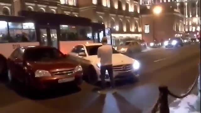В соцсетях появилось видео необычного дорожного инцидента, который в час пик произошел на Каменноостровском проспекте в Санкт-Петербурге. На кадрах видно, как два элитных автомобиля перегородили проезжую часть, полностью парализовав движение.
