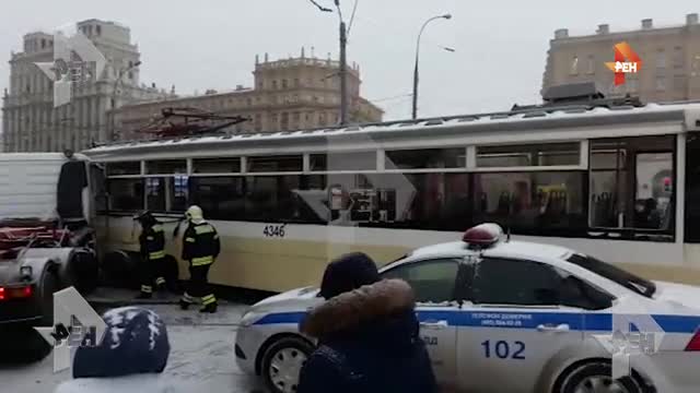 РЕН ТВ публикует первое видео с места столкновения трамвая и автомобиля в Москве