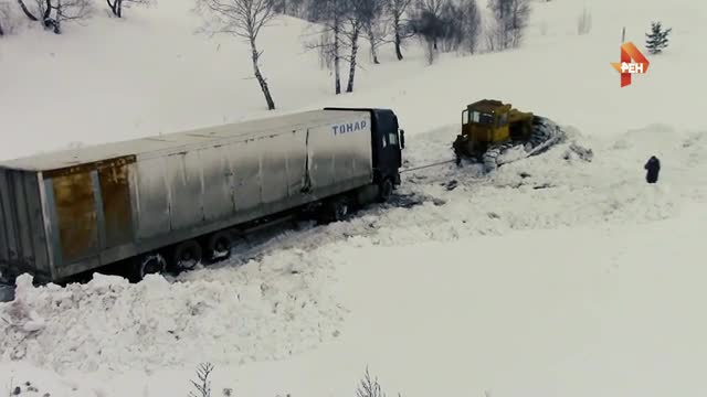 Видео: трактор вывозит застрявшую на трассе фуру с тиграми