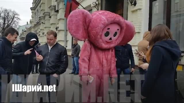 В Сети появилось видео, на котором запечатлен человек в ростовом костюме розового Чебурашки, который появился на месте убийства экс-депутата Госдумы Дениса Вороненкова в Киеве.