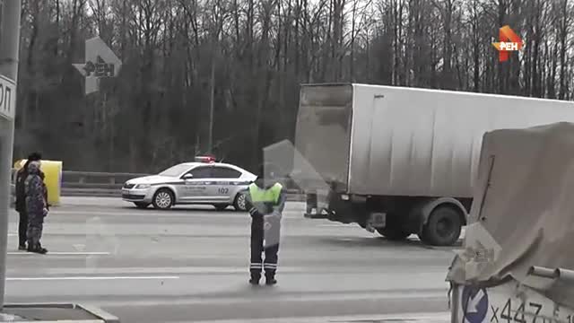Два грузовика "Хендай" и "Ивеко" столкнулись на Киевском шоссе в Москве. По данным источника РЕН ТВ, водитель первой машины из-за резкого торможения второй не успел остановить большегруз.