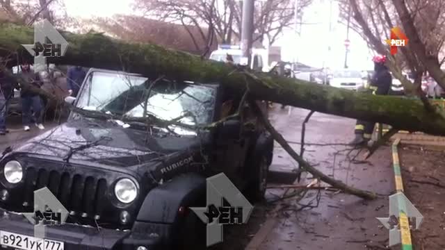 Видео с места падения дерева на припаркованные машины на западе Москвы