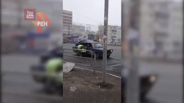 В Челябинске изумленные прохожие увидели, как детская коляска проехала в потоке машин. На записи видно, как мужчина-пассажир высунул ее из открытого окна.