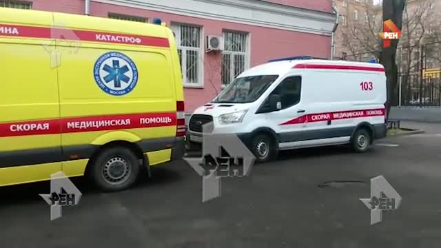 От школы в Москве, где отравились газом дети, поступают первые кадры. У здания стоят кареты скорой помощи.
