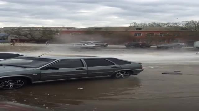 Мощный фонтан забил из-под автомобилей в Астрахани. Очевидцы сняли потоп на видео.