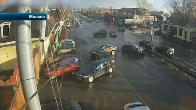 Массовое ДТП произошло в столице. Водитель легкового автомобиля пытался уйти от столкновения с иномаркой на перекрестке, но маневр не удался, и машина влетела в бордюр и протаранила два припаркованных авто.