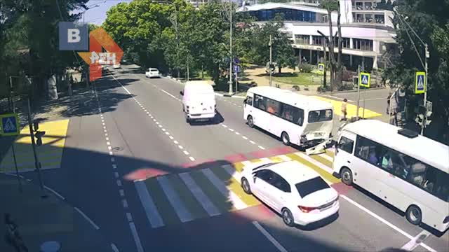 Камера наблюдения запечатлела столкновение двух автобусов в Сочи. Как сообщают СМИ, в результате аварии ранены 9 человек. По предварительным данным, среди пострадавших оказалось пятеро детей.