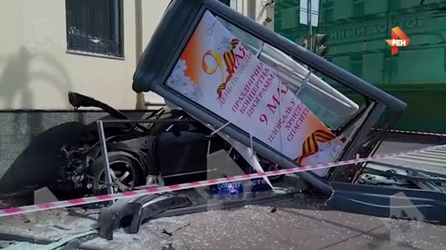 РЕН ТВ публикует видео с Infiniti, снесшим рекламную стойку в Москве