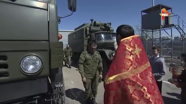 В ходе церемонии протоиерей Михаил освятил пусковые установки "Ярс" и другие образцы военной техники, которые примут участие в параде Победы на Красной площади в Москве.