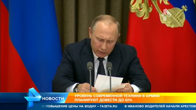 "В 2017 году уровень современного вооружения и техники запланировано довести до 62%. Я прошу Министерство обороны и представителей оборонно-промышленного комплекса ориентироваться именно на этот показатель. Отмечу, что боевой опыт, полученный в ходе операции в Сирийской Арабской Республике, и необходимость укрепления арктических территорий и границ на Западе и Юго-Западе потребовали уточнения подходов к переоснащению войск", - отметил глава государства на совещании.