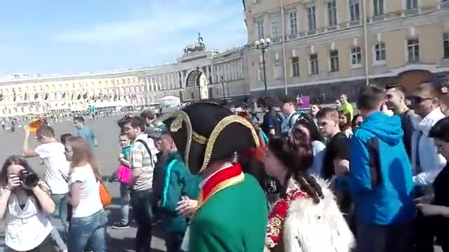 На Дворцовой площади игрок предстал перед публикой в сопровождении актрисы, изображавшей Екатерину Великую. Взглянуть на "императорскую пару" собрались более полутысячи человек.