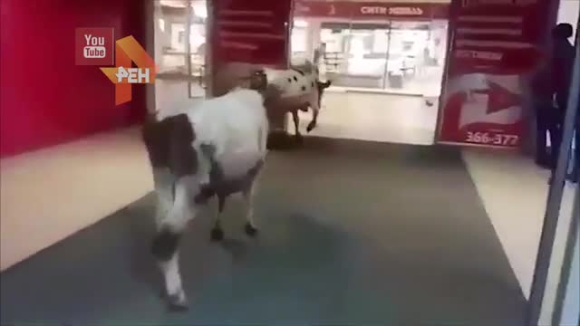 Коровы прошли по парковке и через стеклянные двери зашли в магазин.