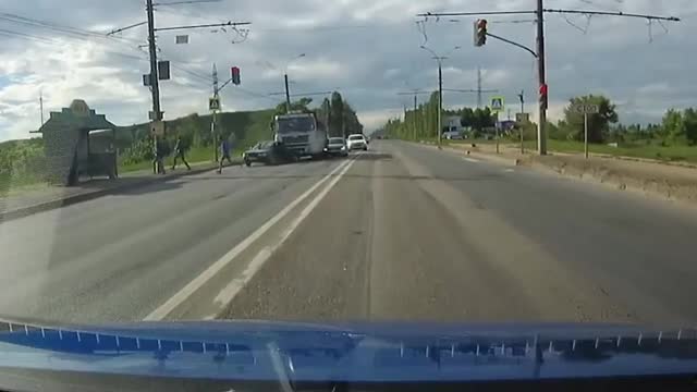 На записи видеорегистратора проезжавшей машины видно, что автомобили останавливаются на красный сигнал светофора, чтобы пропустить пешеходов. В этот момент к светофору на скорости подъезжает грузовик. Большегруз сносит с пути легковой автомобиль, который, в свою очередь, наезжает на пешеходов.