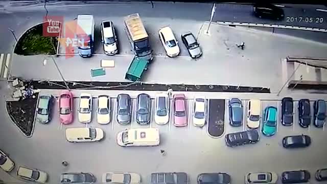 На кадрах видно, как из-за мощного ветра контейнер срывается и падает прямо на прохожего. Припаркованный автомобиль тормозит конструкцию, что позволяет мужчине выбраться из-под нее.