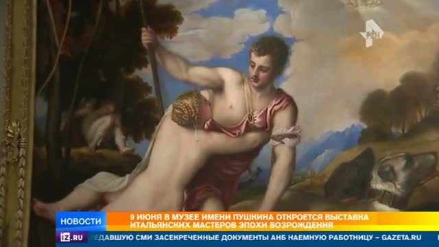 Экспозиция хоть и итальянская, да вот сенсация российская. Картина "Венера и Адонис", принадлежащая одному из отечественных благотворительных фондов, долгие годы считалась лишь копией с картины Тициана, но искусствоведы музея им. А.С. Пушкина доказали — это подлинник.