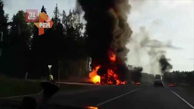 При столкновении бензовоз загорелся, ликвидировать пожар удалось только в 20:35 по московскому времени. Отмечается, что грузовик перевозил 23 тонны топлива.