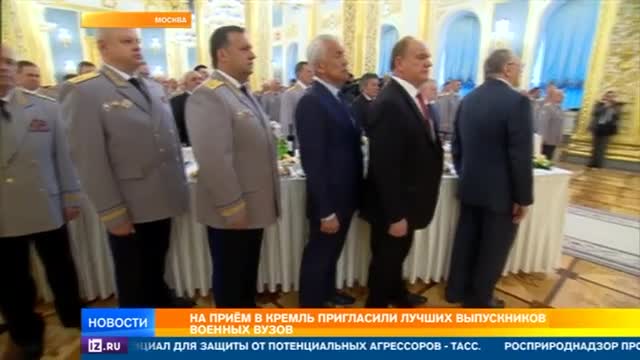 На Соборной площади сияет медь военного оркестра и накрыты сразу три парадных кремлевских зала — Александровский, Георгиевский и Андреевский. Семьсот золотых выпускников российских военных вузов — элита нашей армии. Традиции чествовать их на приеме в Кремле уже больше 80 лет — особая церемония напутствия верховного главнокомандующего.