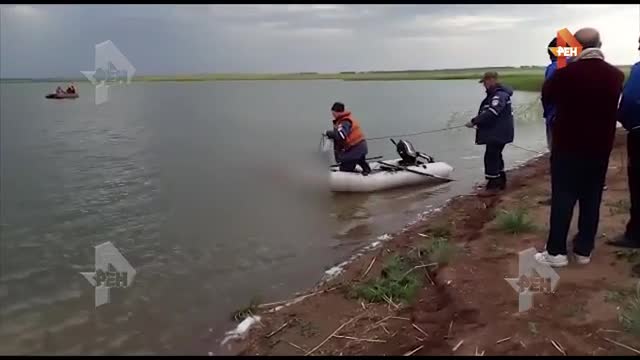 Журналисты РЕН ТВ публикуют видео с тем, как спасатели извлекают тело одного из погибших при ЧП с лодкой в Челябинской области.