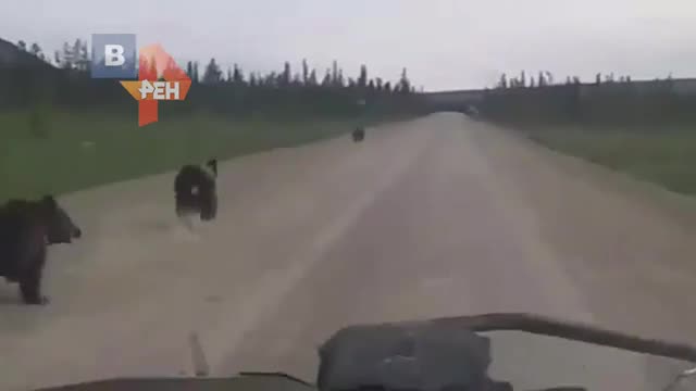 Видео: Взволнованная медведица с тремя медвежатами побежала за авто в Якутии