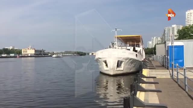 РЕН ТВ публикует последствия инцидента на Москве-реке. Накануне моторист теплохода "Егорий" угнал судно и допустил его столкновение с теплоходом. Он задел его кормовую часть.