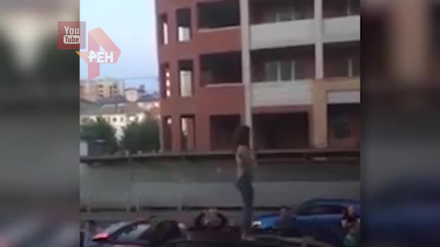 На кадрах видно, как дама в джинсах и бюстгальтере, взобравшись на крышу иномарки, танцует, а в руках у нее находится бутылка шампанского.