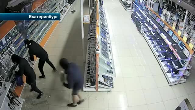 В Екатеринбурге разыскивают воришек, которые через дыру в стене проникли в магазин цифровой техники и унесли смартфоны на 1,5 миллиона рублей На кадрах видно, как стойка с микроволновыми печами разлетается от удара – в отверстие лезут трое преступников.