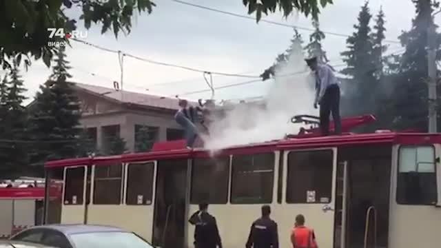 В Челябинске очевидцы засняли на видео полыхающий трамвай
