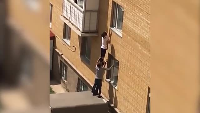 На кадрах видео видно, как двое мужчин стоят на крыше "Газели", а третий – у них на плечах. Вместе они снимают ребенка с подоконника.
