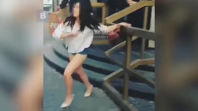 На кадрах видно, как нетрезвая барышня, топчась у порога здания, пытается продемонстрировать свои ягодицы, поднимая ультракороткую джинсовую юбку. Невольные свидетели стриптиза попытались заснять происходящее на видео, причем один из смельчаков даже попытался снять трусы с разгоряченной девушки. Однако этот шаг неадекватной посетительнице заведения не понравился и она набросилась на обидчика с кулаками.