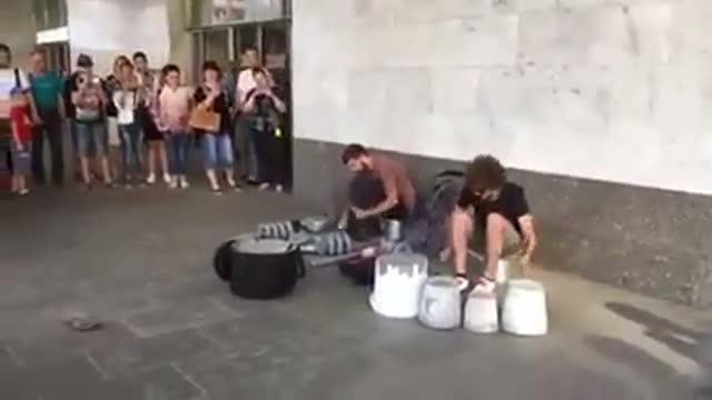 Все шло как обычно, но ровно до тех пор, пока не появилась сотрудница метро и не попыталась прервать уличное выступление. Сначала она обратилась к исполнителям устно, но те никак не отреагировали на то, что к ним обращаются. Чтобы хоть как-то привлечь внимание к себе, женщине пришлось распинать ногами ведра, которые использовал в качестве ударных инструментов один из музыкантов.
