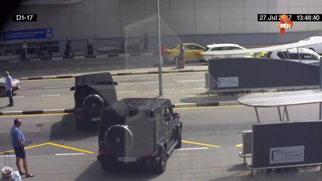 РЕН ТВ публикует кадры видеокамер Шереметьево, на которых видно, как человек, похожий на Тимати, садится в Gelandewagen. Затем иномарки, грубо нарушая ПДД, переезжают тротуары и покидают зону аэропорта.