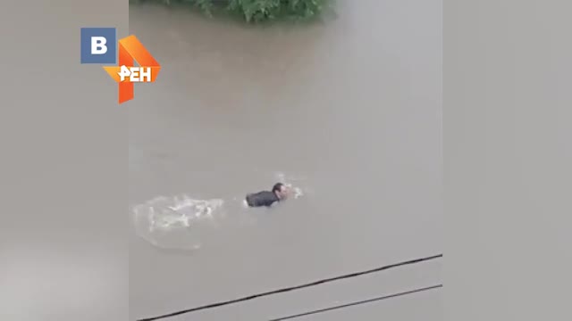 Видео: Житель Красноярска устроил заплыв по улице после мощного ливня