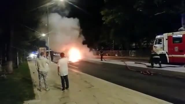 Сообщается также, что водитель успел вовремя покинуть объятый пламенем автомобиль. По словам очевидцев, бордюр служил ограждением для трамвайных путей.
