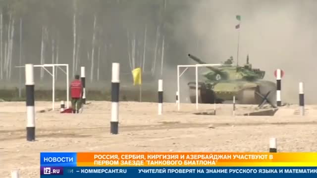 Русский танк летит к финишу как ракета: преодолевает макет моста, брод, курган, загружает боеприпасы.