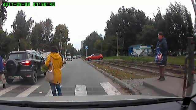 Автомобиль, из салона которого велась съемка, притормозил перед нерегулируемым пешеходным переходом, чтобы дать пройти пешеходам.
