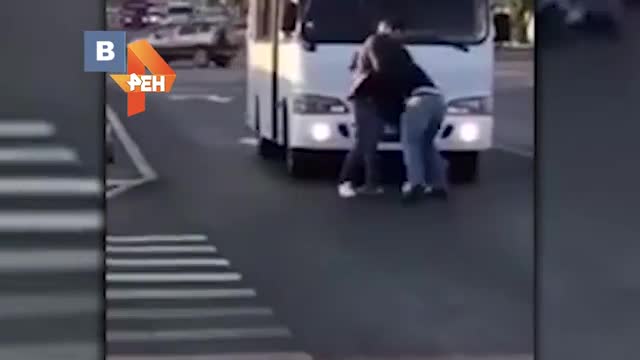 Видео: водитель и пассажир автобуса в Краснодаре подрались прямо посреди дороги