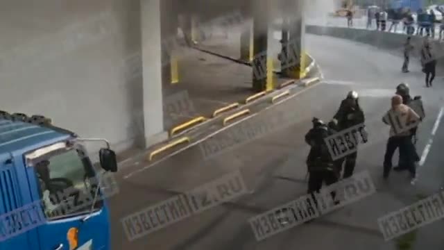 Журналисты РЕН ТВ публикуют захватывающие дух кадры спасения грузовика из объятого пламенем торгового центра "Синдика".