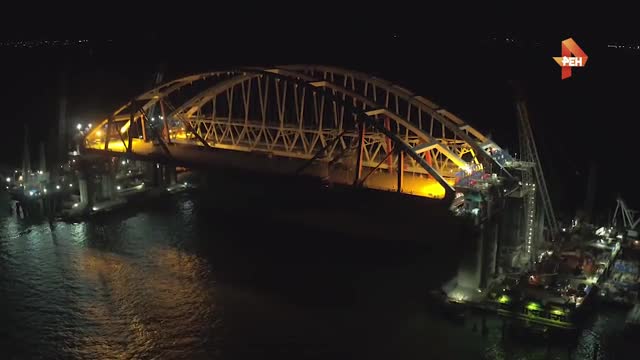 В Керченском проливе продолжаются уникальные работы по установке на опоры автодорожной арки, вес которой составляет 5 тысяч тонн.