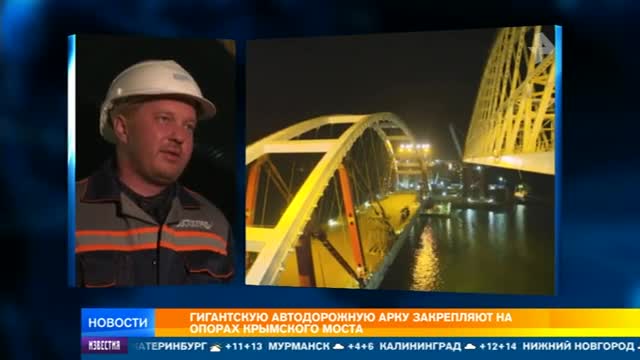 По данным инфоцентра "Крымский мост", накануне вечером строители завершили подъем арочного пролета на проектную высоту — 35 метров и приступили к его закреплению на фарватерные опоры.